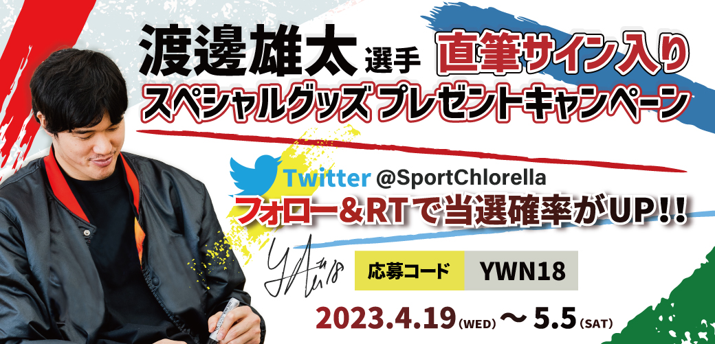 | 応募条件 | オンラインショップでキャンペーンコード「YWN18」をご入力の上、 さらに、@SportChlorellaをフォロー&キャンペーン投稿をRT(リツイート)で当選確率がアップ! |